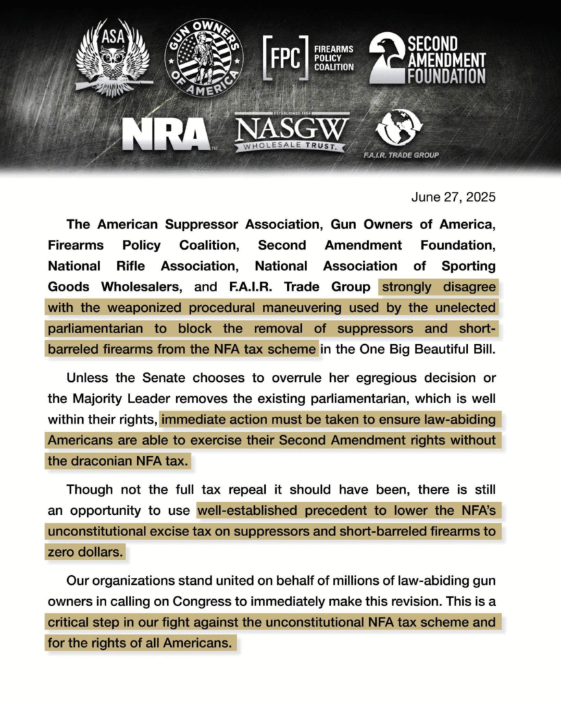 A coalition of the groups fighting for NFA reform which included the NRA, the American Suppressor Association, GOA, SAF, FPC, and others released this statement yesterday.