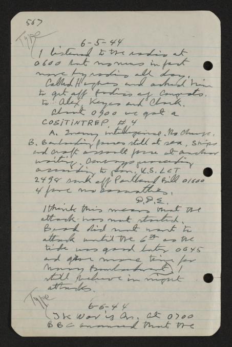 6-5-44 (I listened to the radio at 0600 but no news in fact none by radio all day. Called Hughes and asked him to get off radio of congrats. to Alex, Keyes and Clark. About 0900 we got a COSITINTREP #4 A. Enemy intelligence. No change. B. Bombarding forces still at sea. Ships and craft assault force at anchor waiting. Convoys proceeding according to plan. U. S. LCT 2498 sunk off Portland Bill 01600 4 June no casualties. D.D.E. I think this means that the attack has not started. Brad did not want to attack until the 6th as the tide was good later 0645 and gave more time for Navy Bombardment.) I still believe in night attacks.