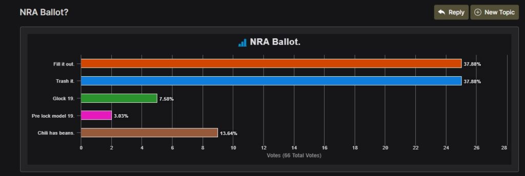 Now to the next matter. A friend noticed this poll on AR15.com. It was asking what people intended to do with their NRA ballots. Sadly, only little more than a third said they were going to fill them out and submit them. An equal number said they planned to trash them. I know it is Arfcom which is not always a good indicator.