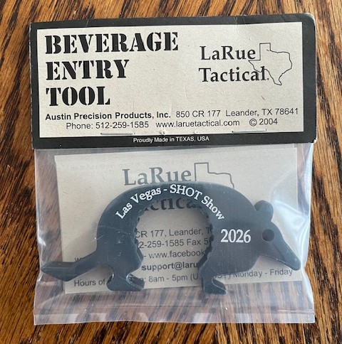 Then there is the perennial favorite that I always try to collect, the Dillo, from LaRue Tactical. It is a tactical “beverage entry tool.” LaRue makes great barrels and triggers among other items.