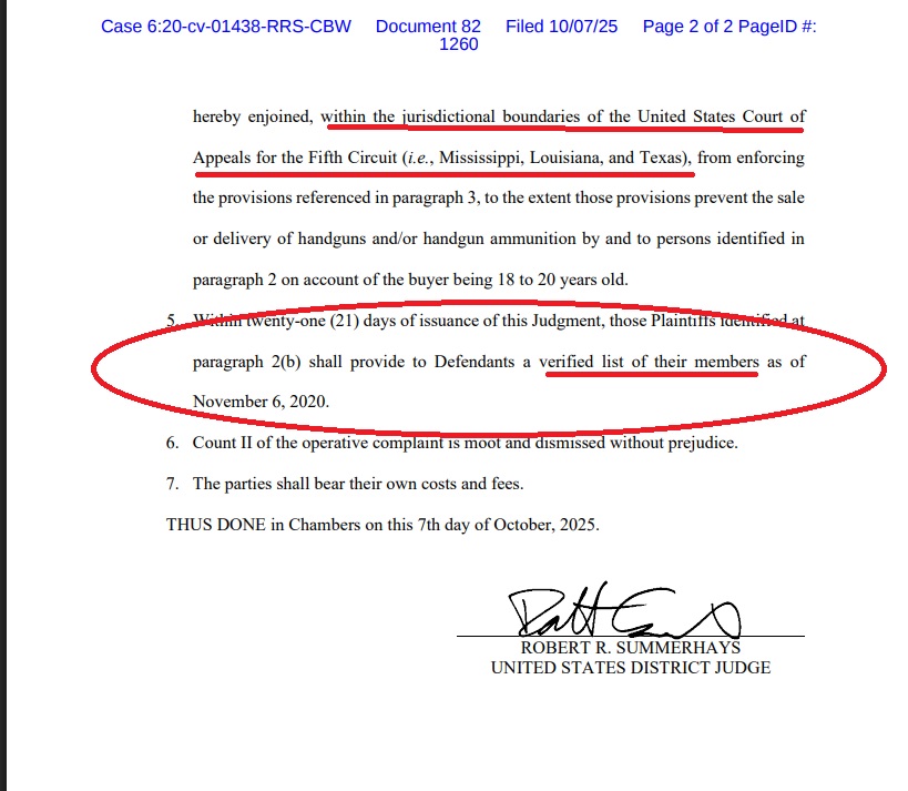 The judgment found for the plaintiffs including members of the Firearms Policy Coalition, the Second Amendment Foundation, and the Louisiana Shooting Association if they were members in 2020 when the case was filed. However, Judge Summerhays restricted the injunction on the ATF to only the states of Mississippi, Louisiana, and Texas or the geographical area of the 5th Circuit. That, unfortunately, was not the worse part of the judgment.